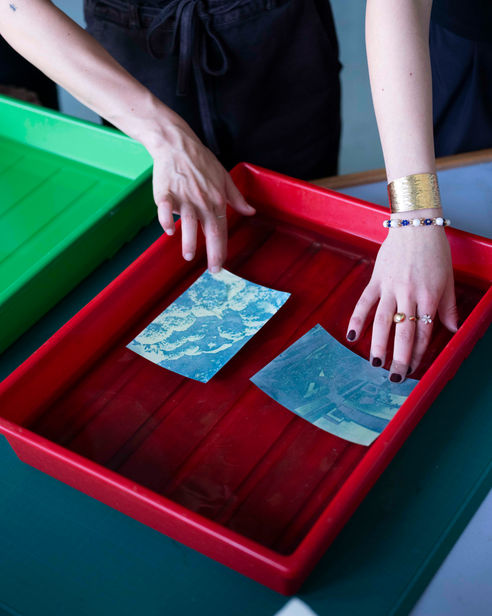 Atelier donné avec Coline Jourdan dans le cadre des Ateliers Maezad. Partant d'images du territoire, aussi bien argentique que numérique, les participantes à cet atelier ont pu réaliser des cartes postales pour leurs futures correspondances en tirages cyanotype, virage couleur et empreinte en linogravure.